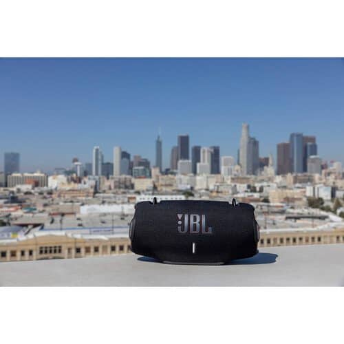 Ready to provide your next outdoor adventure with massive JBL Pro Sound, the Xtreme 4 Portable Wireless Waterproof Speaker from JBL in blue, features dual 2.8″ woofers, dual 0.7″ tweeters, and dual passive radiators. Your music will sound balanced and have benefit of rich, deep bass response; even at high volumes thanks to AI Sound Boost. Experience the great outdoors without worry as you stream your favorite music via Bluetooth. The Xtreme 4 is waterproof, dustproof, and has rugged rubber bumpers to handle bumps and impacts. The huge, replaceable battery can play your music for up to 24 hours, with an extra 6 hours available via a tap of Playtime Boost.