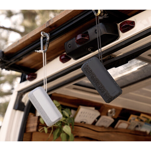 - An integrated strap lets you carry the speaker with you or hang it up to play audio for everyone nearby